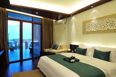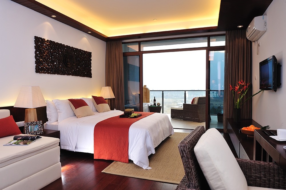 酒店雙子樓波浪的外觀造型和大海完美融合,目前共計有500多間客房。有雅致雙/大、海景雙/大、豪華海景雙/大、家庭房、豪華海景家庭套房、豪華行政海景套房等6種房型,客房的特色除了面積大、有陽臺、有浴缸、衛生間干濕分離,就是5層以上每一間客房的陽臺都能看到博鰲的海岸線,性價比高。