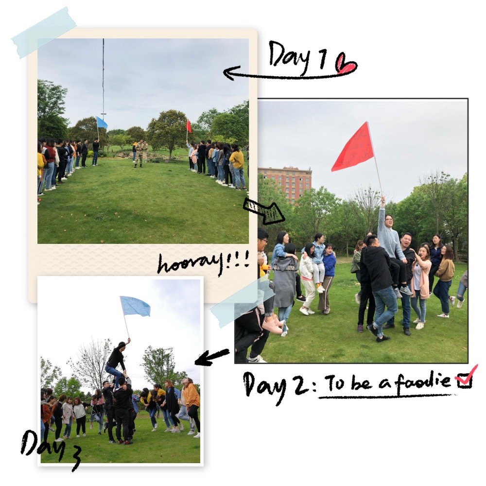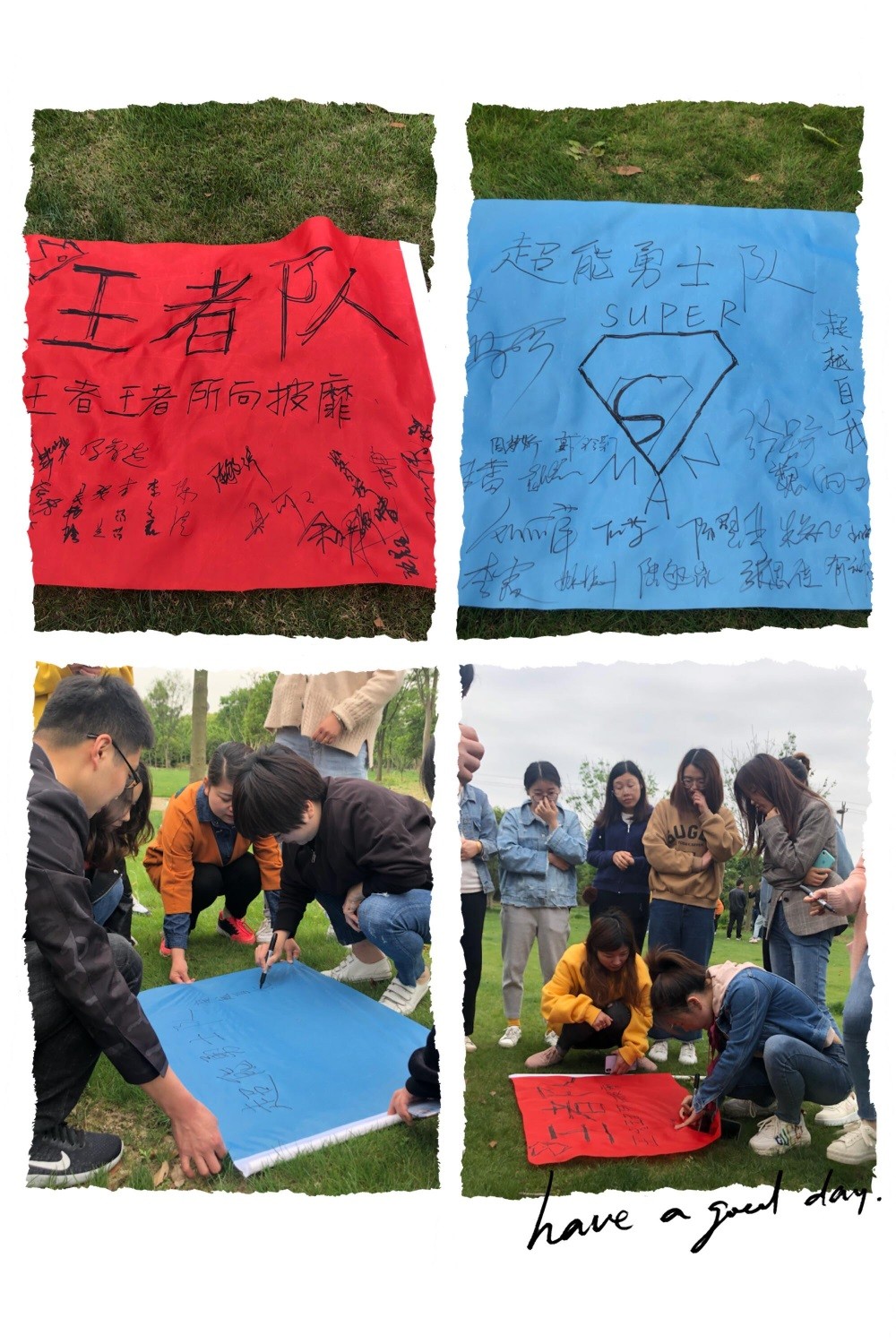 熱身運動結束后活動就正式開始啦,根據教官的指示,全體學員分成兩組,每組設計自己的隊名、隊標和口號。瞧,在大家的齊心協力下,“王者隊”和“超能勇士隊”就這樣誕生啦!不管結果怎樣,隊名要靚,口號要響,氣勢上要能壓倒對方。