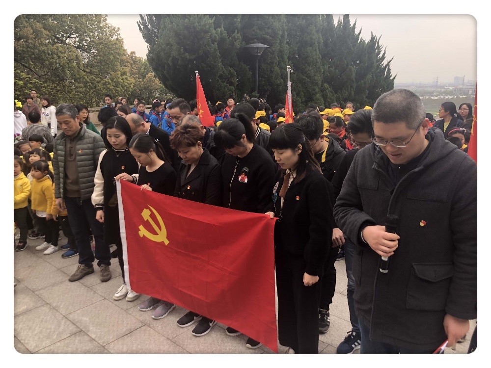 接著,黨員們拾級而上,一氣呵成來到了高高在上的紀念碑前,看到碑上刻著八個大字:革命烈士永垂不朽。全體黨員在烈士紀念碑前默哀1分鐘, 由李江東帶領全體人員面對黨旗鄭重重溫了入黨誓詞,一字一句鏗鏘有力,充分表達了黨員們團結一致,恪守黨員承諾、彰顯爭創模范黨員的決心。
